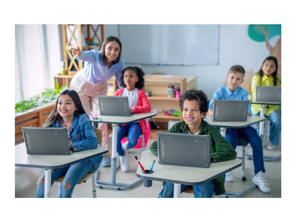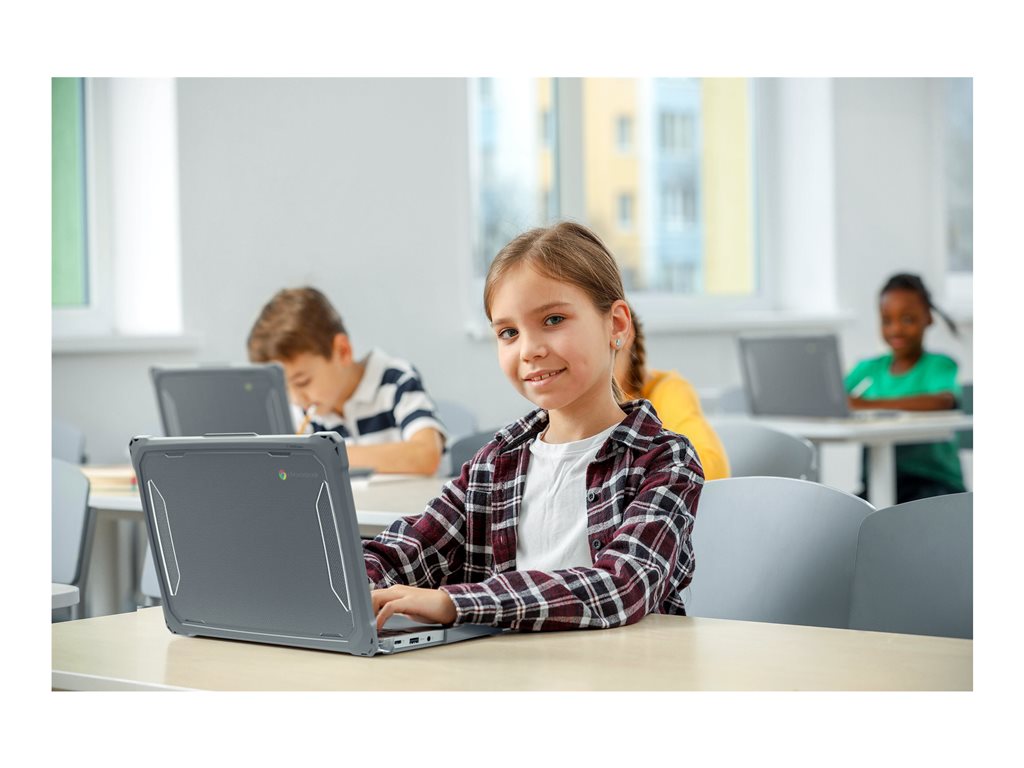 Featuring MAXCases' patented slide-on top design, the Extreme Shell-F Slide Case V3 protects Chromebooks with slide-on ease and enhanced screen protection in an updated, lighter-weight design. The slimmer top design further reduces carrying weight, without sacrificing durability or protection, while providing a sleek and easy-to-clean surface. The updated corners provide a slimmer profile designed to enhance protection under a wide range of impact circumstances. The innovative slide design disperses pressure evenly around the entire top perimeter, for a snug fit that eliminates pressure hotspots around the screen. Crafted with dual layers of tough TPU for outstanding impact and drop protection, the ESF3 case combines a cushioning inner layer with an oil- and dirt-resistant outer layer and is tested to meet MIL-STD 810G-516.6 for four-foot drops. The clear, rigid top and bottom panels prevent exterior damage and provide visibility for stickers and asset tags. The custom fit ensures easy access to all buttons and ports. For added convenience, the V3 design accommodates a handy carrying strap that fits snuggly against the case (sold separately).