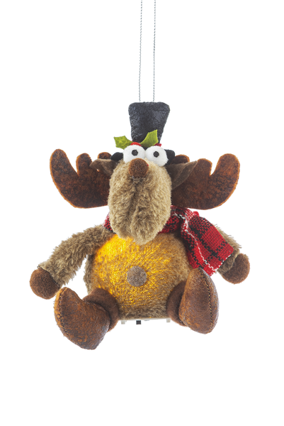 These Light up Moose are soft plush material that can be hung as an ornament or set on a table. The belly lights up with a button cell battery