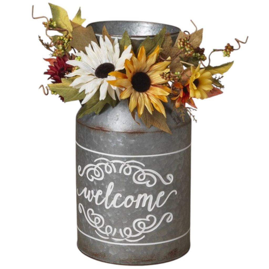 Embrace the beauty of autumn and create a warm greeting for your guests with our delightful Welcome Galvanized Floral Vase, standing at an inviting 15.5 inches tall. Crafted from durable galvanized metal, this charming piece features an embossed "welcome" message at its center, making it the perfect addition to your entryway or porch. Topped with vibrant faux floral accents, including cheerful sunflowers and rich autumnal foliage, it offers a pop of color that captures the essence of the harvest season.