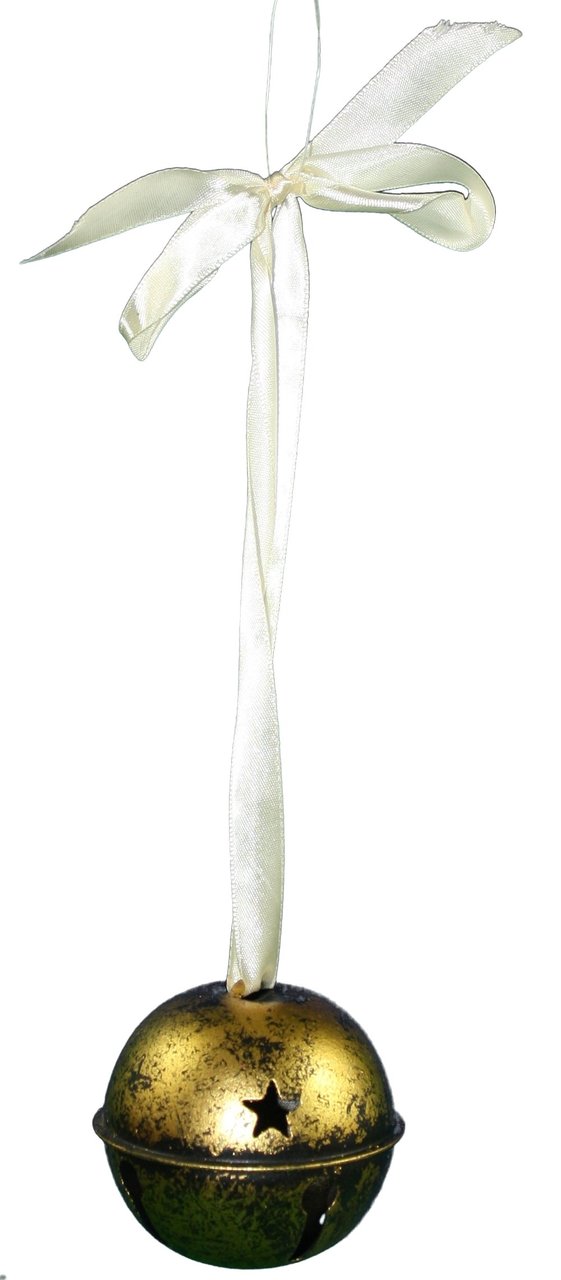 A working metal Jingle Bell approx 2.5 inches in diameter with An antique painted finish attached to a generous 14 inch Fabric Ribbon for hanging on a tree, wreath, or even a doorknob.