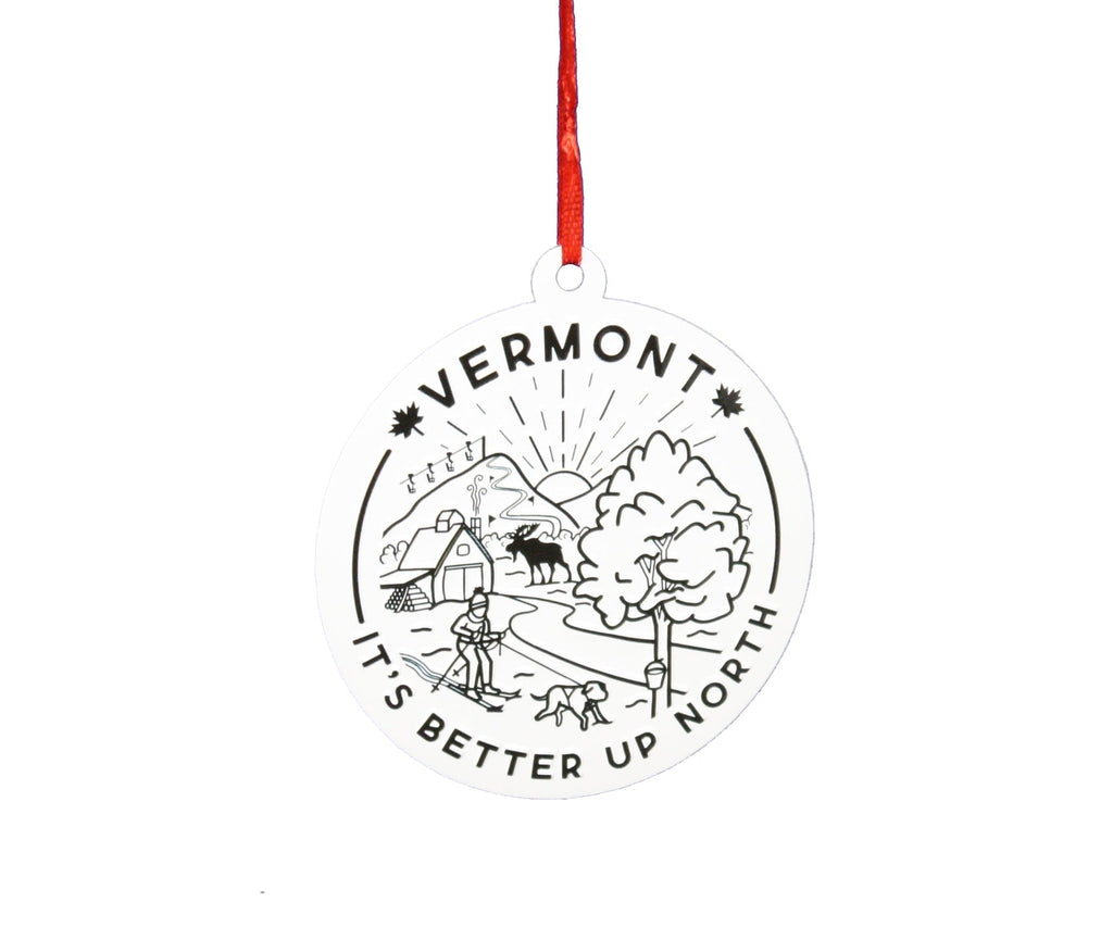 2-sided round metal ornament with a Vermont Winter Sports scene. It reads "Vermont - It's Better up North"