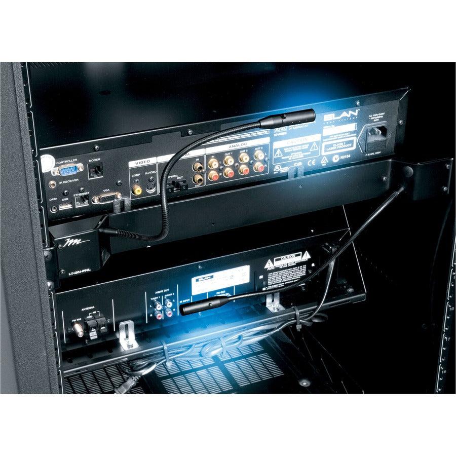 These bright rack lights (187 Lumens) allow for more rack visibility, and the flexible strong goosenect lets you direct the light where it is needed most. The reliable, long lasting LEDs have a 20,000 hour bulb life, and these lights include an on/off button for instant control. Available as 120V adapter, or as a rackmount panel with dual gooseneck lights.