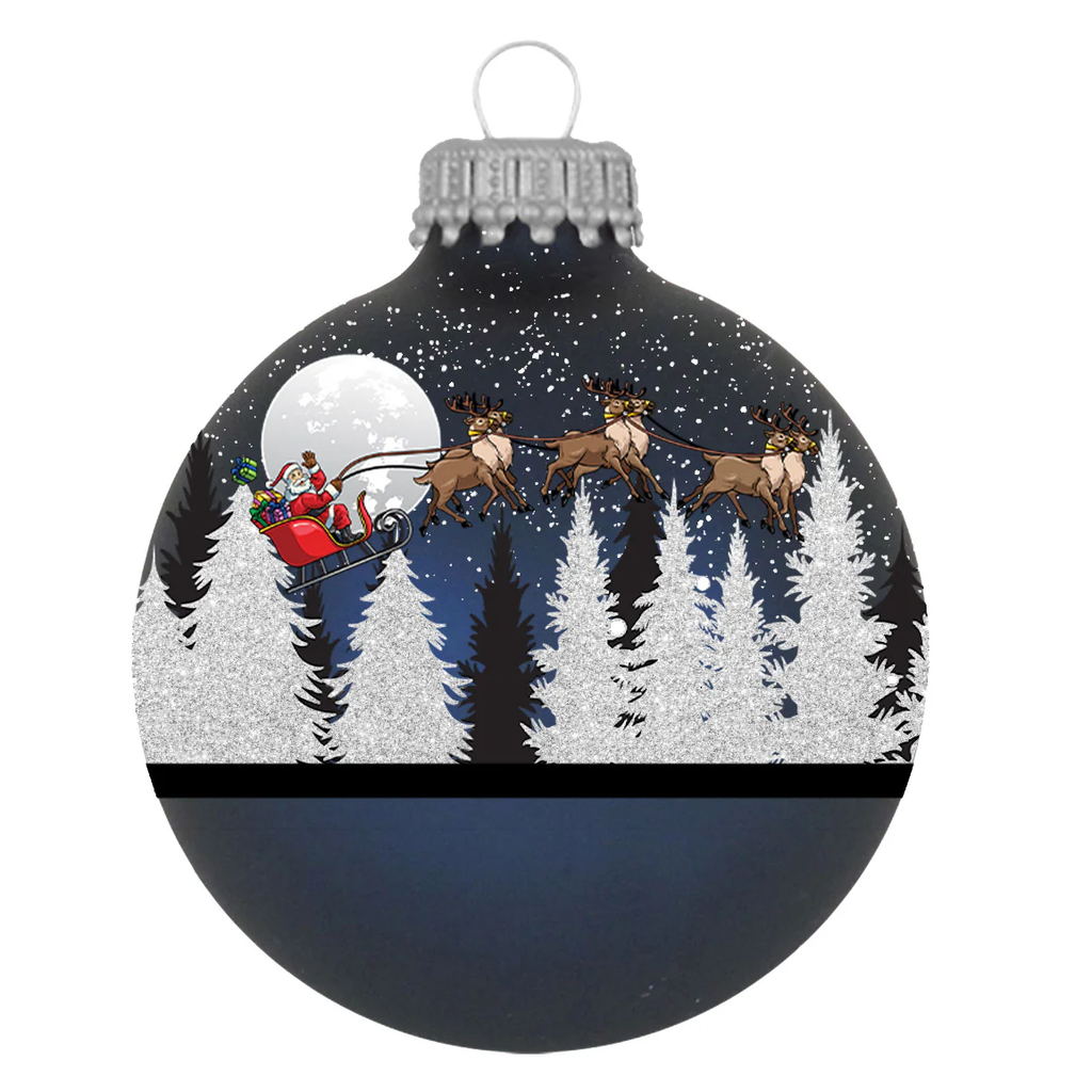 Embrace the magic of the season with this enchanting 4-piece set of Midnight Haze Velvet Glass Ornaments from "Christmas by Krebs." Each ornament, measuring 2.5 inches in diameter, features a captivating design that showcases Santa and his reindeer dashing through a starry night sky, framed by glistening silver trees that sparkle with holiday spirit. The rich, velvety finish adds an air of elegance, making these ornaments a stunning addition to your Christmas tree.