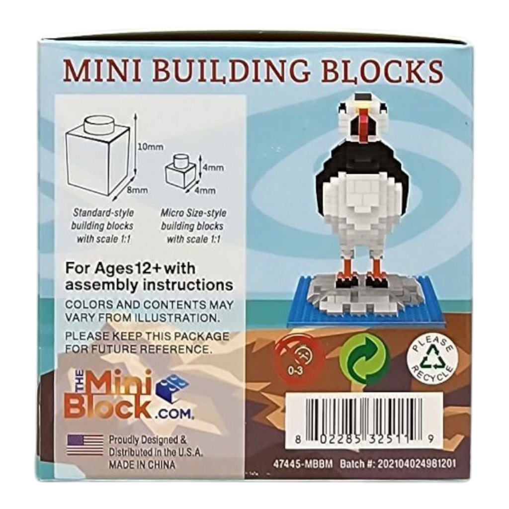 Soar to the cliffs of the Atlantic with the Mini Building Blocks Puffin set! This adorable kit includes 443 pieces, perfect for builders aged 12 and up. The completed model stands just over 4.5 inches tall and almost 4 inches long, capturing the distinctive charm and bright colors of the puffin in stunning detail. This lifelike figure, perched atop a rocky base, brings the whimsical beauty of these beloved seabirds right into your home.