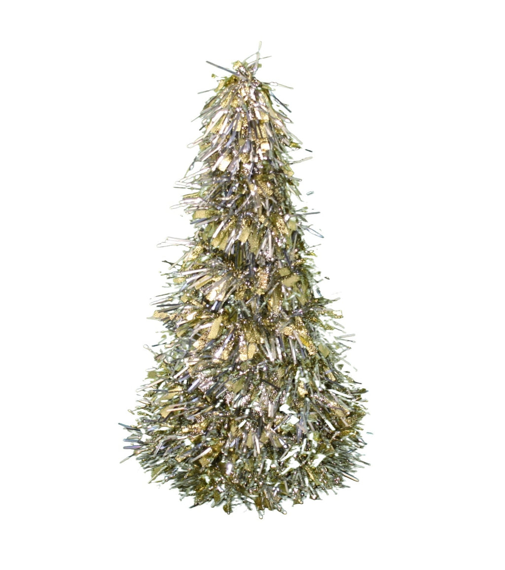 10 Inch tall cone tree in 4.7 inches wide and festivly decorated with tinsel. Ideal for party centerpieces or just adding an accent to your holiday village.