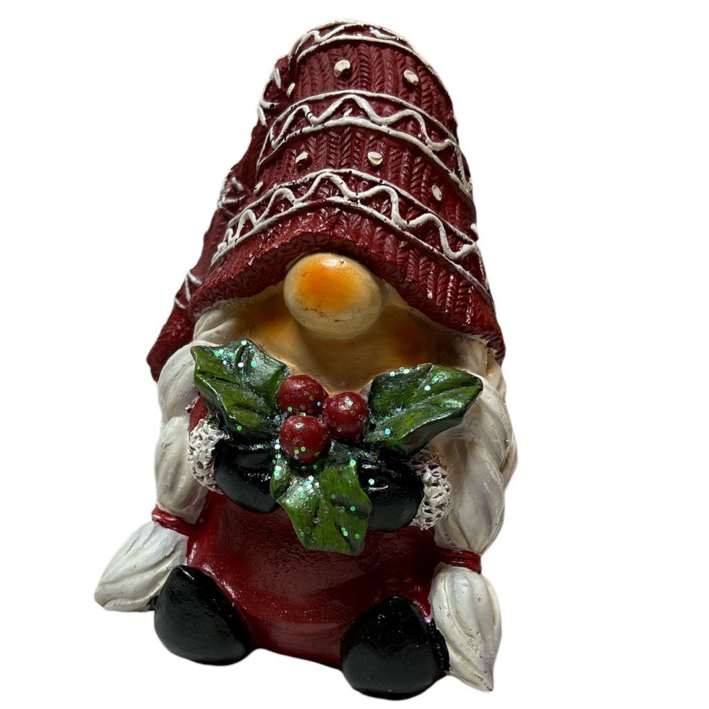 Add a whimsical touch to your holiday decor with this delightful 5.3-inch Resin Holiday Gnome Figurine. Lovingly crafted, this charming gnome sports a cozy, intricately patterned hat in festive red and holds a sprig of sparkling mistletoe, ready to add a dash of holiday romance and cheer.