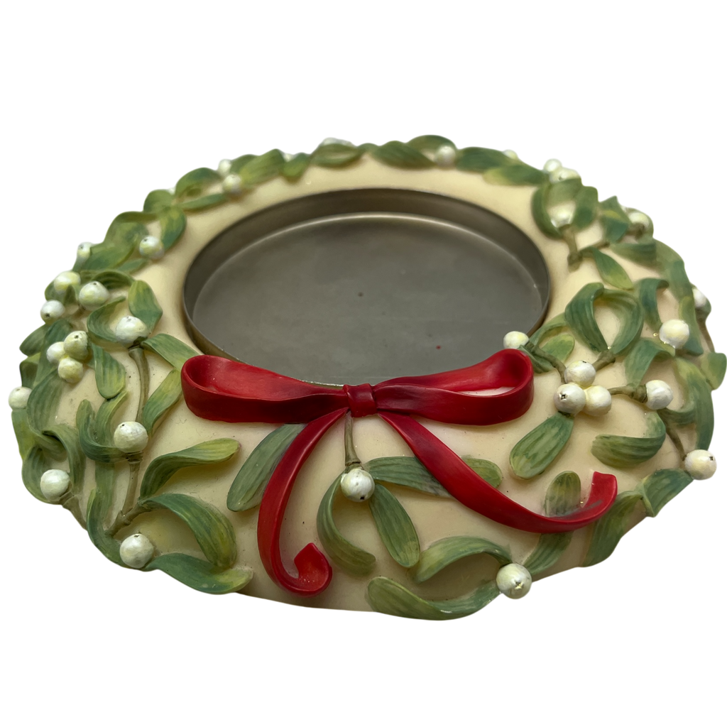 Illuminate your holiday gatherings with this exquisite Hand-Painted Holiday Wreath Candle Holder! Designed to elegantly hold a pillar candle or a wine bottle, this stunning piece showcases the beauty of the season with its intricate detailing of lush greenery, delicate faux pearls, and a charming red bow. Measuring approximately eight inches wide and just under two inches tall, it's the perfect centerpiece for your Christmas dining table or festive mantle.