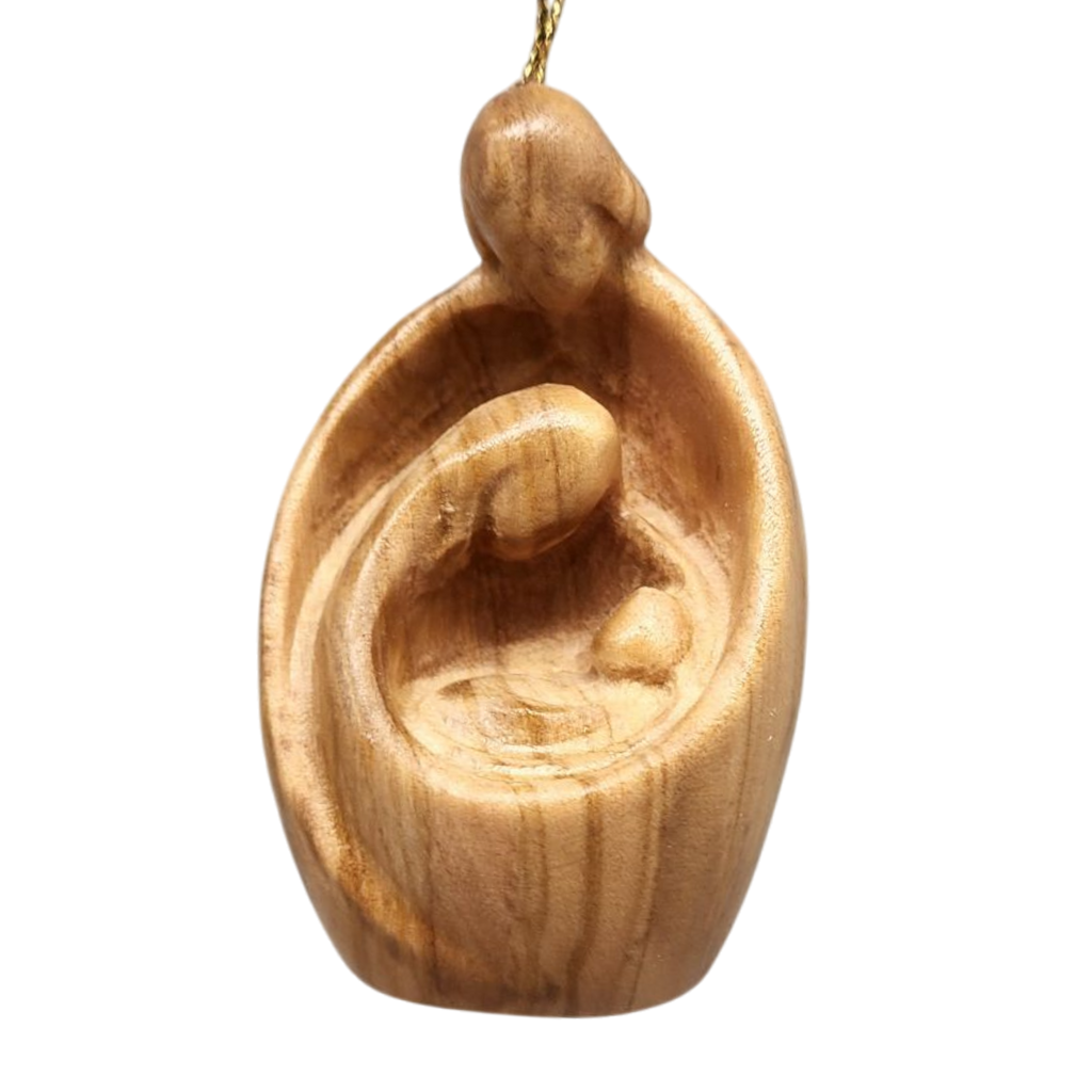 Presenting our beautifully crafted "Holy Family" nativity ornament, hand-carved from exquisite Olive wood in Italy. This stunning piece features an intricate depiction of Mary, Joseph, and Baby Jesus, capturing their serene and loving essence within a sleek, oval-shaped frame.