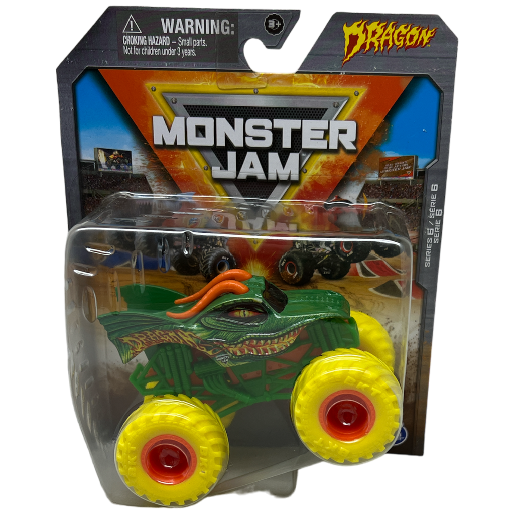 Browse the Complete Gifts & Holiday Collection This image showcases a Monster Jam toy from the popular truck series, featuring the distinctive "Dragon" design. The toy truck is encased in a durable plastic packaging that prominently displays the vibrant vehicle with green and yellow bodywork, and large yellow wheels. The "Monster Jam" branding is prominently featured at the top, capturing the rugged and action-packed spirit of the monster truck shows.