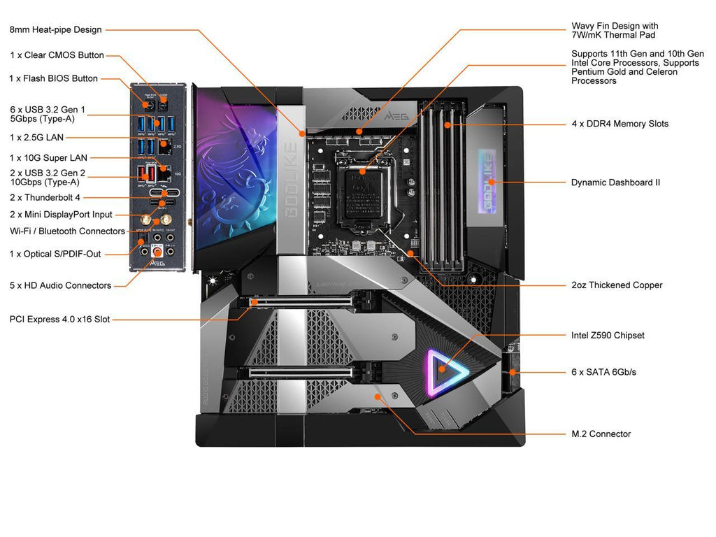 MEG Z590 GODLIKE features Wavy fin design, 8mm heatpipe, 7W/mK thermal pads, Frozr Heatsink and Aluminum Backplate to ensure the extreme performance with low temp.