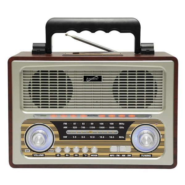 Built-in Bluetooth(R) receiver Dynamic high performance speakers AM/FM/SW 3 band radio USB/SD(TM)/Micro SD(TM) input compatible Telescopic antenna Analog volume control Built-in speaker Output power: 2 x 3 watts Operating distance: 32.8 ft. Play time: 2 hours AC/DC operation 6-volt, 1,400 mAh rechargeable battery Frequency range: AM: 520 KHz to 1620 KHz/FM: 87 60108.0 Mhz/SW: 5.9 to 18.0MHz Frequency response: 100 Hz to 16 KHz