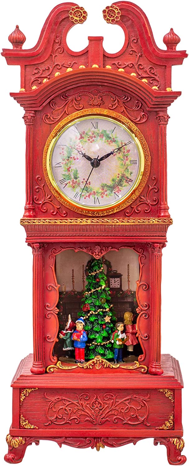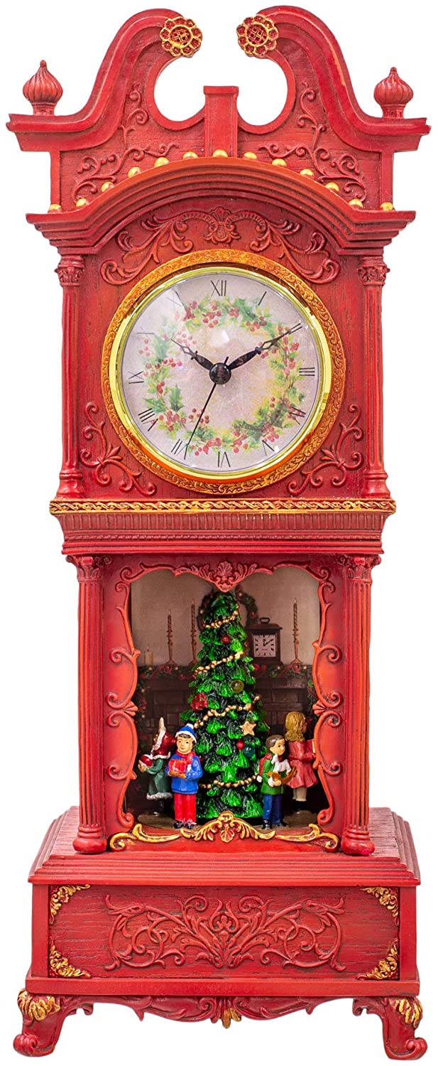 Musical LED Rotating Santa Shelf Clock features a rotating Santa with a tree in the base and analog clock face on top; Plays various Christmas tunes