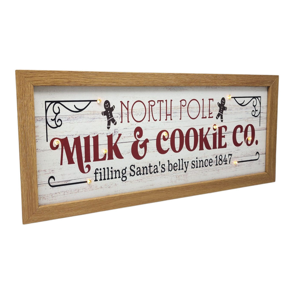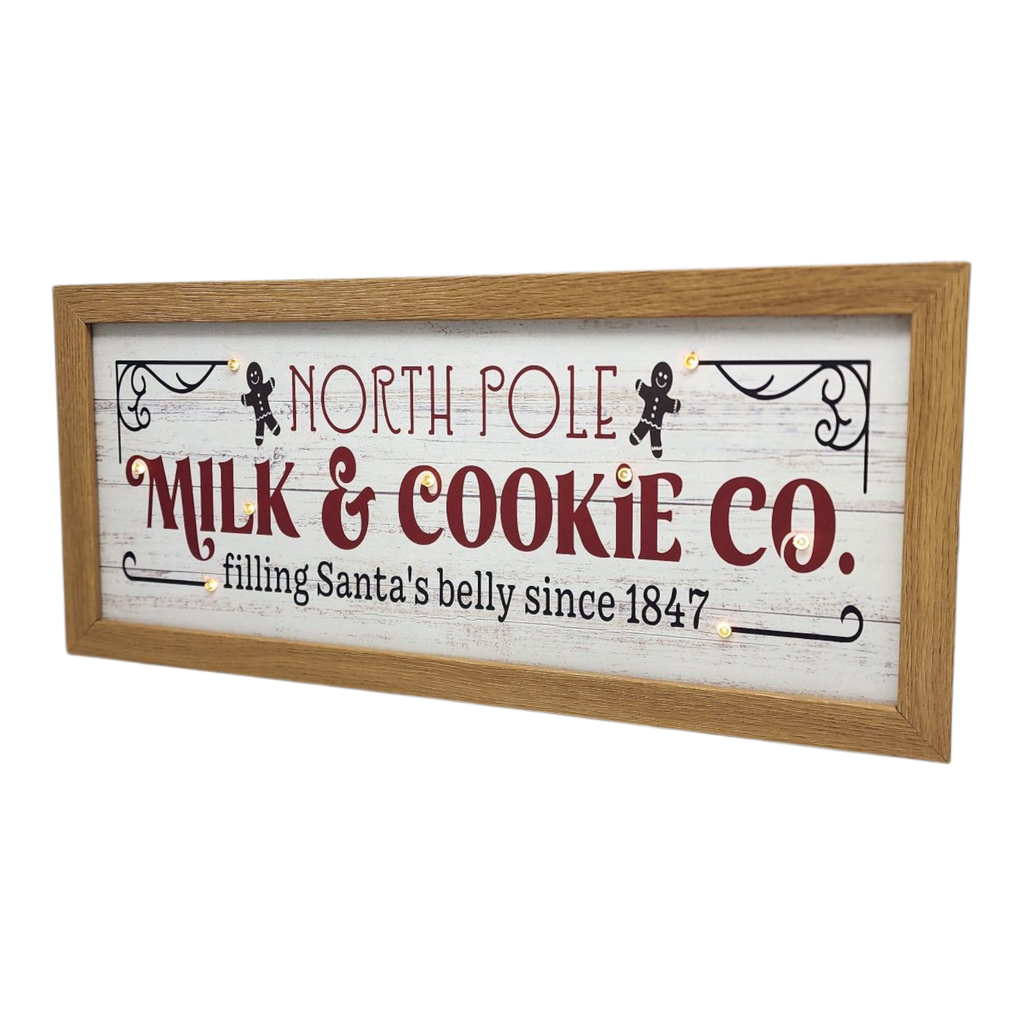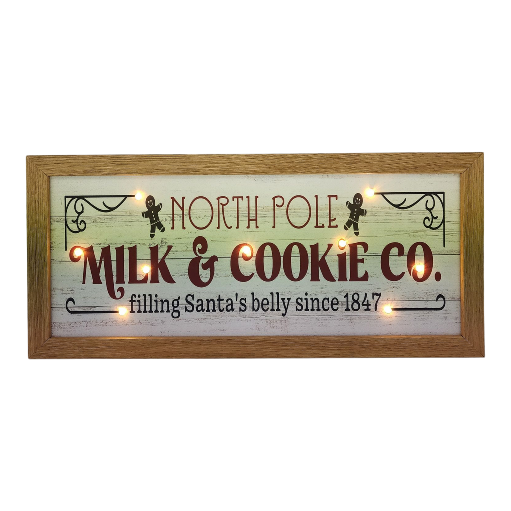 Bring the magic of Christmas to your home with the enchanting North Pole Milk & Cookie Co. Lighted Sign! Measuring 15.75 inches in length, this charming wood design features a rustic aesthetic that perfectly captures the spirit of the holiday season. With its beautifully crafted graphics and warm LED lights, this sign is sure to create a cozy, festive atmosphere that beckons family and friends to gather around and share delightful moments. It's a perfect addition to your kitchen, dining area, or entryway, inviting everyone to partake in the timeless tradition of leaving treats for Santa!