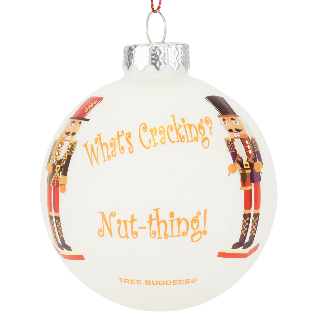 This fun glass bulb ornament shows two Nutcrackers with a dad joke that reads, What’s Cracking? Nut-thing! Lol