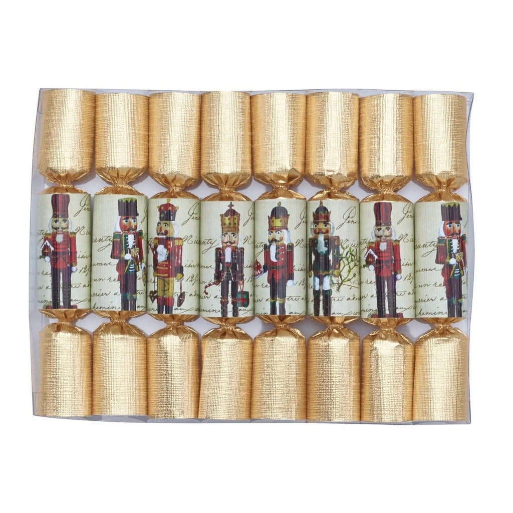 Browse the Complete Gifts & Holiday Collection Gold Christmas crackers with " Classic Nutcracker" print of various Nutcrackers on a script parchment background.