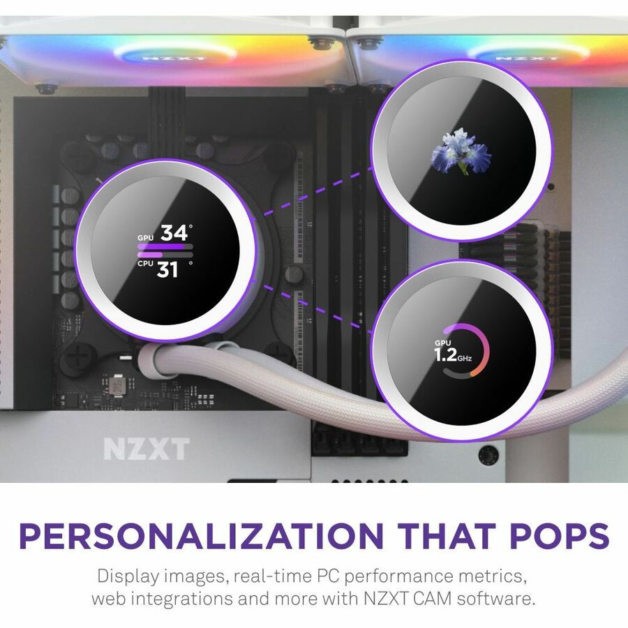 - Control custom screen content, RGB, pump speed, and zero-noise fan curves with NZXT CAM software.