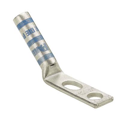 Two-hole, long barrel lug with window, #10 AWG wire, 1/4" stud hole, .50" – .63" hole spacing, 45° angle tongue.