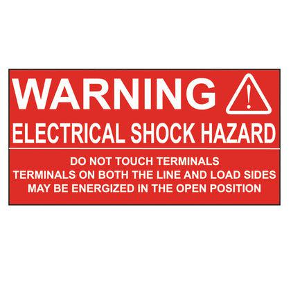 Solar label, 2.0" H x 4.0" W (50.8mm x 101.6mm), warning header, 'Electrical shock hazard do not touch terminals terminals on both the line and load sides may be energized in the open position' (legend), polyester adhesive, white/red
