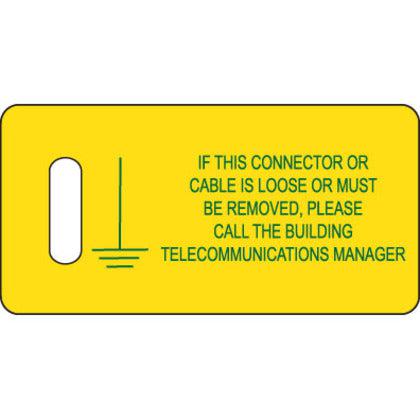Ground warning tag, 2.75" W x 1.38" H, 'Network building ground' (legend), semi-rigid polyethylene, green/yellow, 100 tags/package, 1 pc. package quantity.