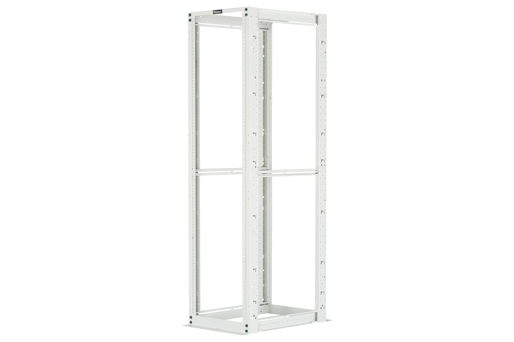 The premium Panduit Four-post Rack System combines the stability of a cabinet with the accessibility of an open rack to provide the user with maximum flexibility when designing a data-center network layout. Four steel vertical posts and adjustable front and rear mounting rails provide the required strength and flexibility needed to work with various types of active equipment. Steel, 52 RU, 36in deep, #12-24 Threaded Mounting Holes, White, 1pc + hardware kit and paint piercing bonding kit.