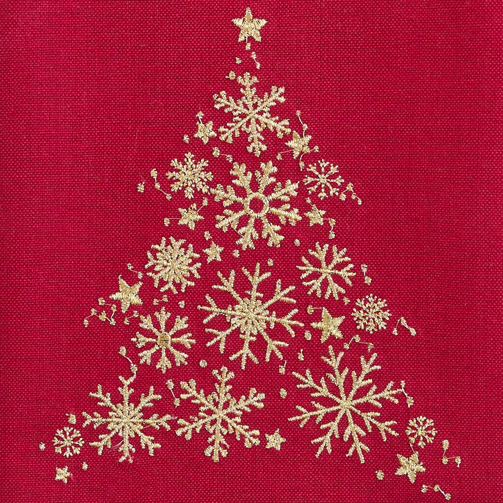 Bring a touch of elegance and festive spirit to your kitchen with this Patricia Heaton Designed Decorative Dish Towel. Crafted from 100% cotton, this 18" x 28" dish towel features a beautiful embroidered design that captures the essence of the holiday season. The rich red fabric showcases a stunning Christmas tree made entirely of intricate gold snowflakes, adding a luxurious and stylish touch to your home decor.
