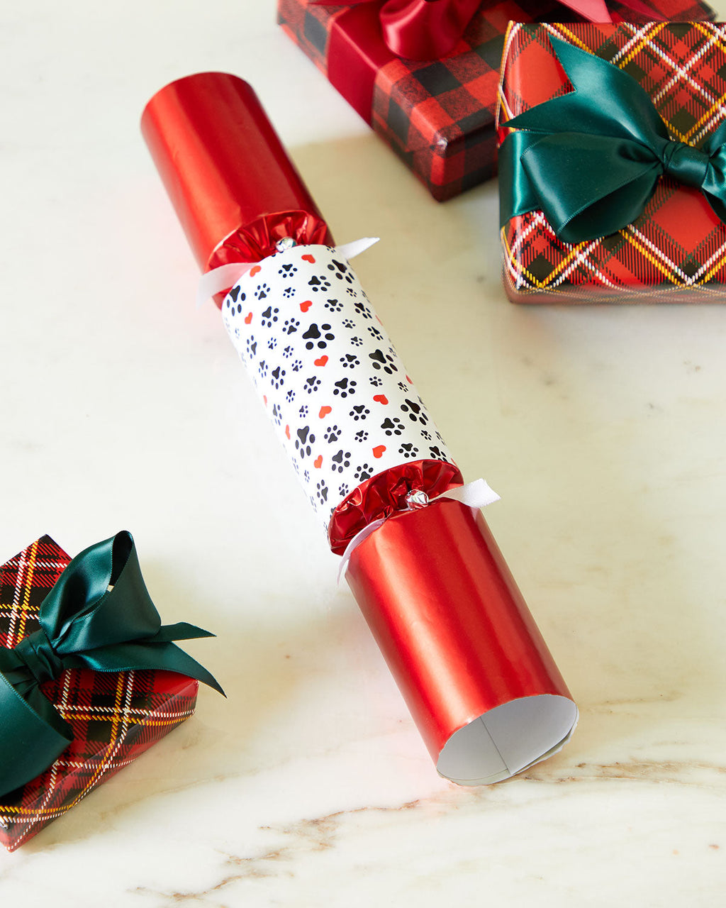 English-style Christmas cracker, handcrafted of paper and finished with hand-tied bows.