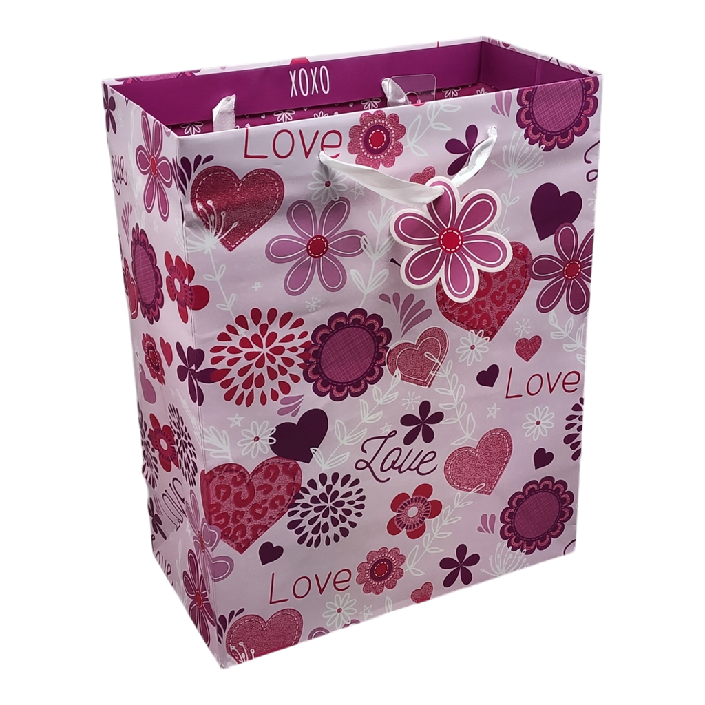 Celebrate love in style with our charming gift bag, perfect for any occasion! Measuring 12.5 inches by 10 inches by 5.25 inches, this delightful bag features a vibrant design with colorful hearts and flowers, accented with the word "Love" in playful fonts. The combination of pink, red, and purple hues creates a cheerful aesthetic that is sure to make any gift feel extra special.