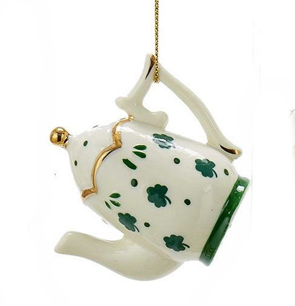 Celebrate Irish heritage this holiday season with these porcelain Irish teacup and teapot ornaments from Kurt Adler. Features elegant teacups and teapots with an Irish design in green and gold. Choose from a teapot with gold accents on the lid a teapot with gold accent on the body a teacup with gold accent on the rim and a teacup with a green vine design on the saucer.