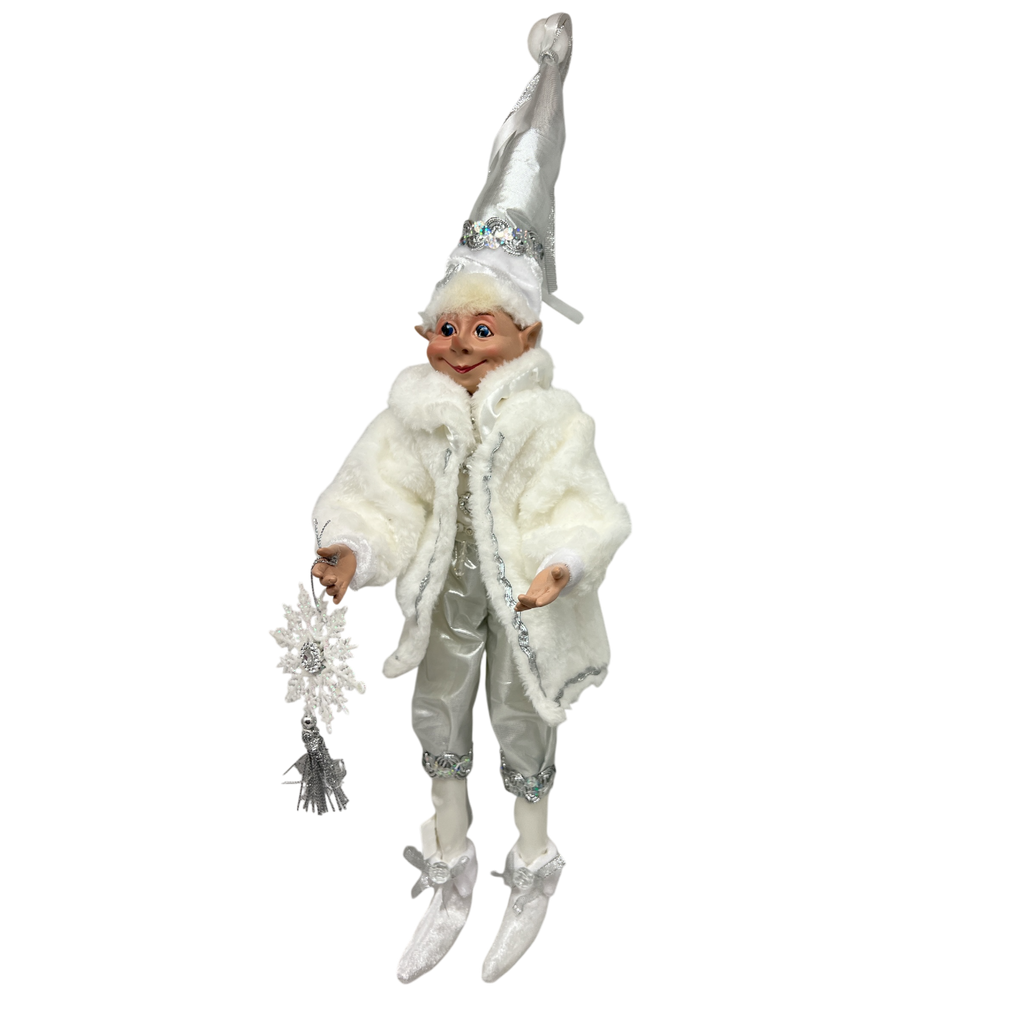 The 16-inch Posable Whimsical Winter Elf with Snowflake is a charming addition to your festive decor. Dressed in a luxurious white faux fur coat and shimmering silver trousers, this elf is ready to bring the magic of winter into your home. Its sparkling snowflake accessory and tall, pointed hat with glittery details add an extra touch of wonder, making it a delightful piece for both children and adults.