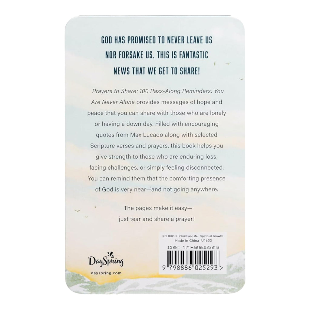 Discover the comforting message of companionship with our "Prayers to Share: 100 Pass-Along Reminders: You Are Never Alone" collection! These beautifully crafted cards serve as heartfelt reminders that God's presence is with us in every moment, no matter the challenges we face. Measuring just over 4 inches, each card features encouraging words from Max Lucado that will lift spirits and provide peace during trials or mundane days alike. Fun for thought: Research indicates that feeling connected and supported can significantly enhance emotional well-being, making this collection a thoughtful companion for anyone experiencing loneliness or uncertainty.