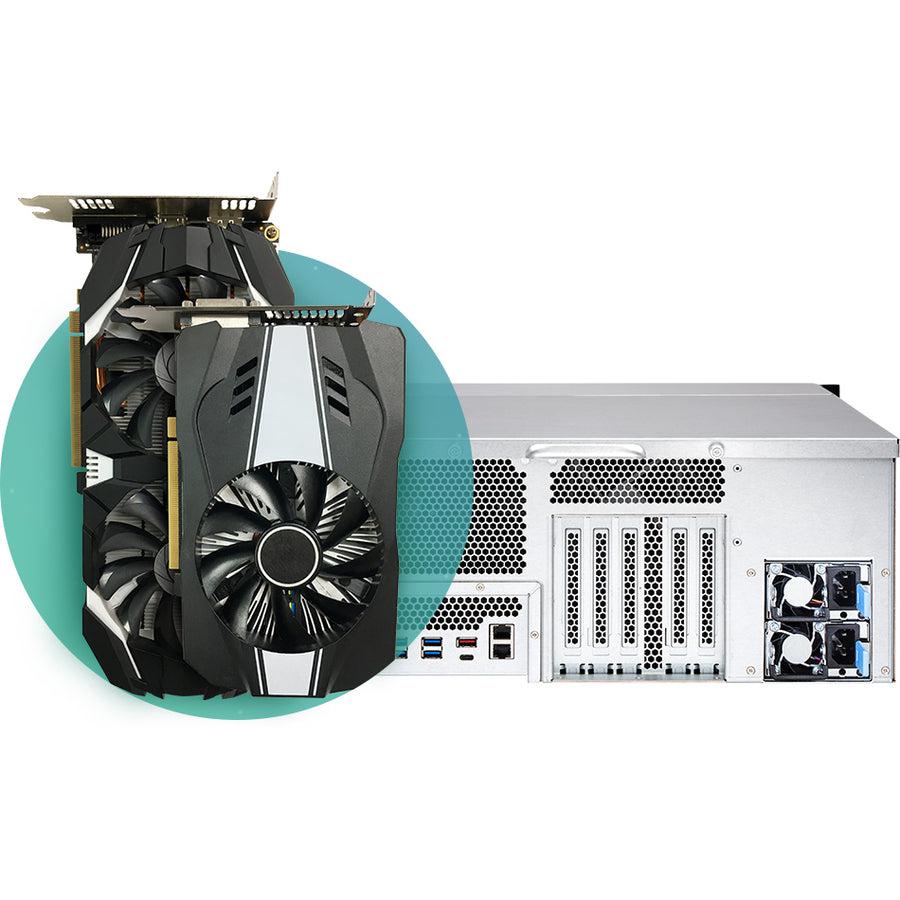 Run multiple graphics cards in your TS-2477XU-RP to unleash greater potential Featuring four PCIe slots, the TS-2477XU-RP allows you to insert up to two high-end graphics cards that work cooperatively to deliver incredible computing performance over a single graphics card. It helps lead to greater potential for accelerating NAS video processing and GPU computing, empowering data-intensive AI machine learning, and realizing GPU-passthrough to VMs.