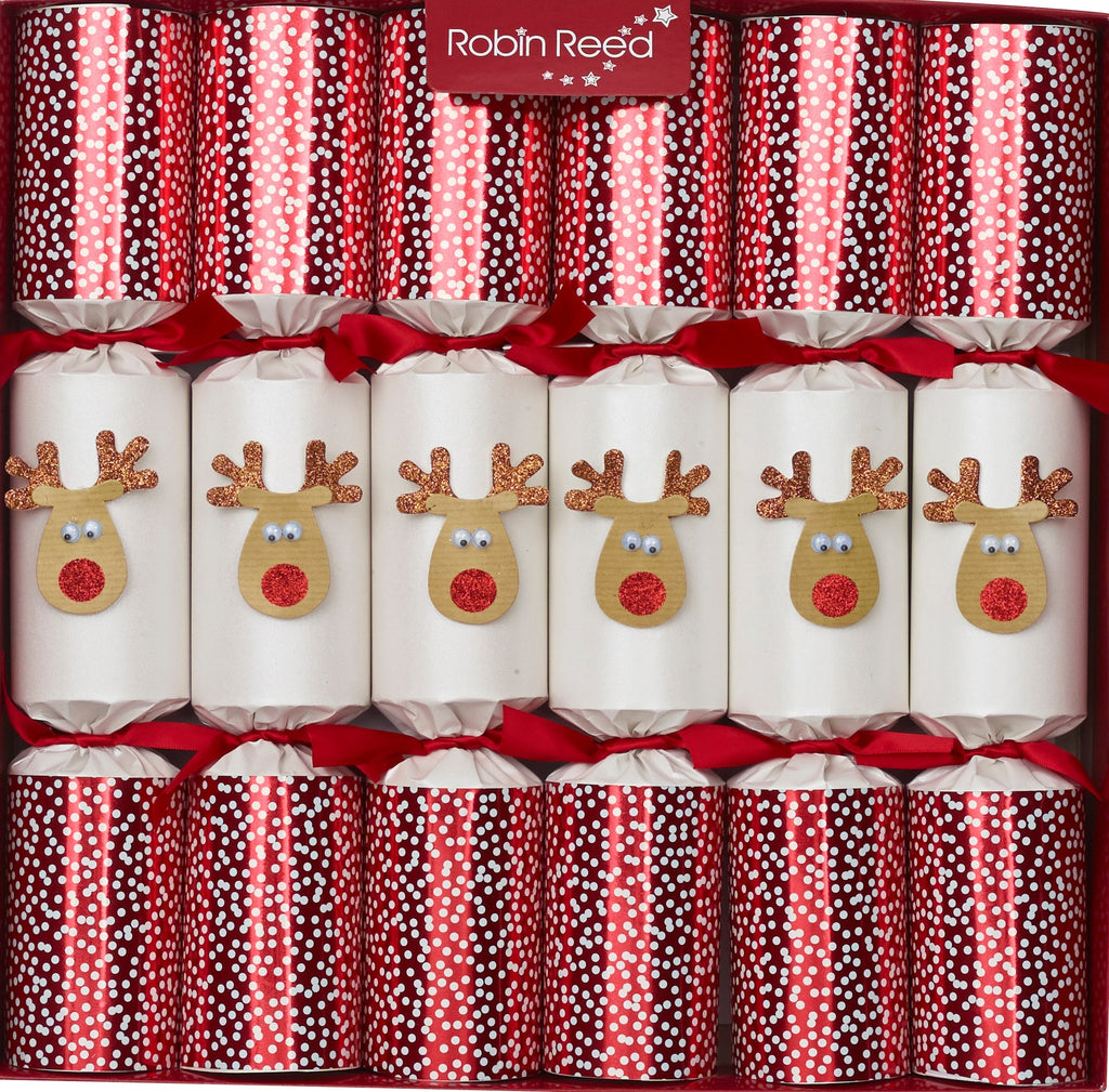 Each 13" (33cm) Christmas cracker contains a snap, amusing joke, party hat and a wind-up Racing Reindeer.