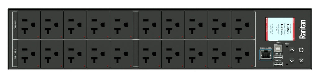 The Raritan Dominion PX3-5453R is an intelligent power distribution unit (PDU) designed for data centers and IT environments requiring advanced monitoring and management capabilities. This device supports real-time remote management of power usage, delivering insights into voltage, current, power (KVA), and energy consumption through an integrated display and network interface.