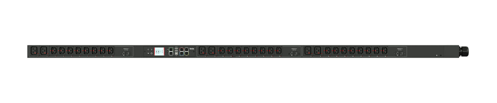 Monitored PDU with switched outlets for 3-phase power distribution. Intelligent rack PDU with 12.6kVA capacity and remote management.