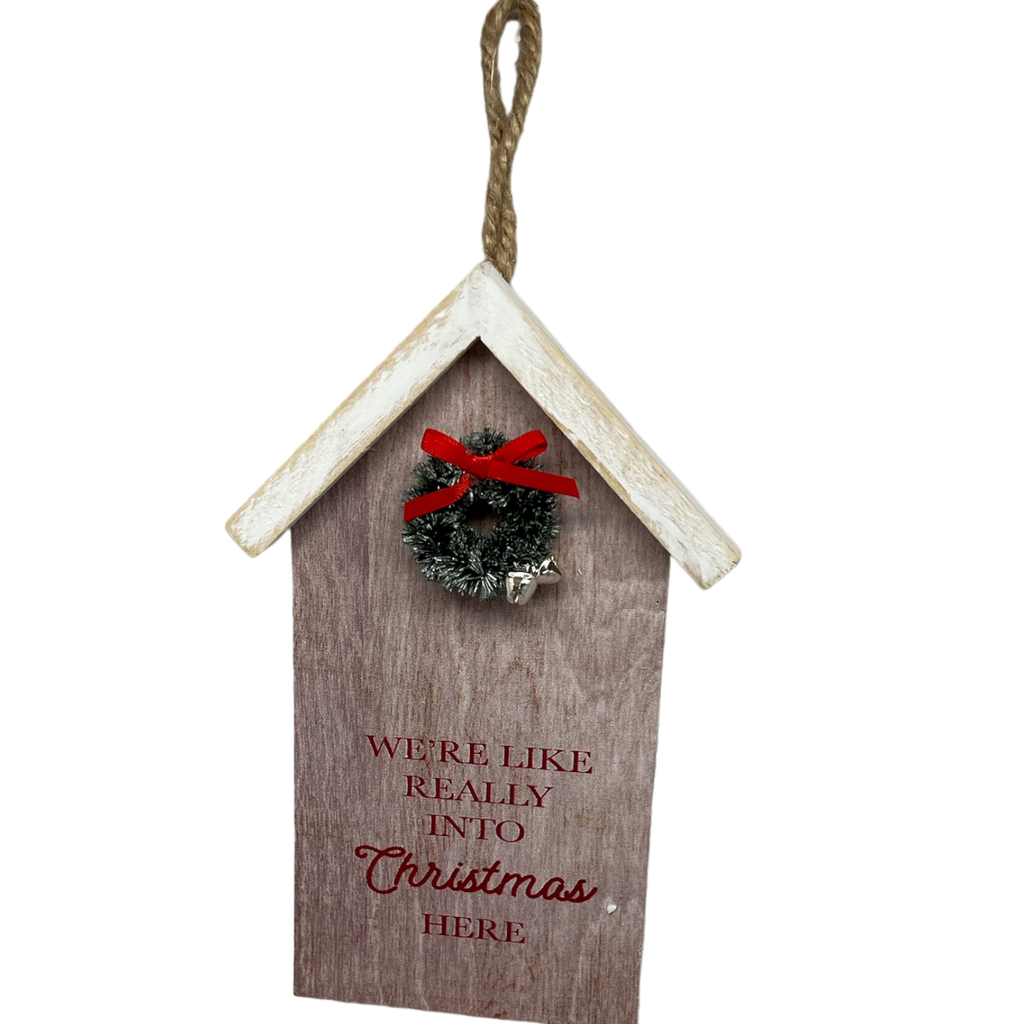 The house features a natural wood finish with a whitewashed roof, enhancing its vintage appeal. At the center, a small, lush wreath adorned with a festive red ribbon and tiny jingle bells adds a joyful accent. The playful inscription on the front reads, "We’re like really into Christmas here," beautifully scripted in cheerful red letters, reflecting your love for the holiday season.