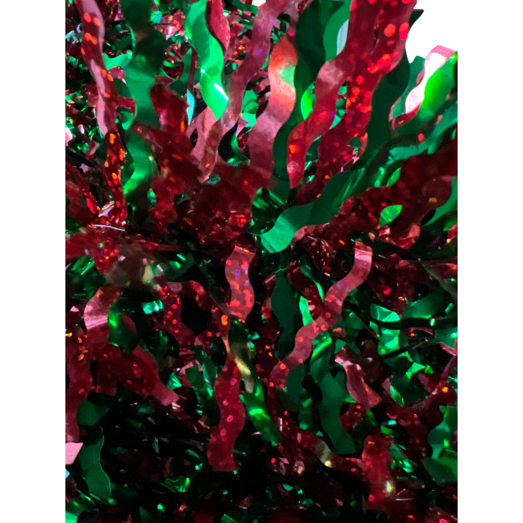 - Made of durable tinsel in vibrant red and green colors with holographic accents