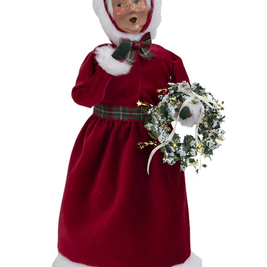 Even Mrs Claus is getting in the spirit of Christmas Caroling this year. When she isn't taking care of the Big Guy, she runs the North Pole and keeps everything running smooth as Silk. She stands approximately 13 inches tall, with a classic Red Velvet outfit. This year, she carries a wreath, and has a beautiful Tartan Plain bow.