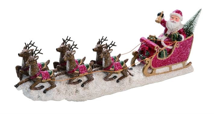 Perfect for sitting atop your mantel or tabletop, Santas Sleigh being pulled by six reindeer adds a festive touch