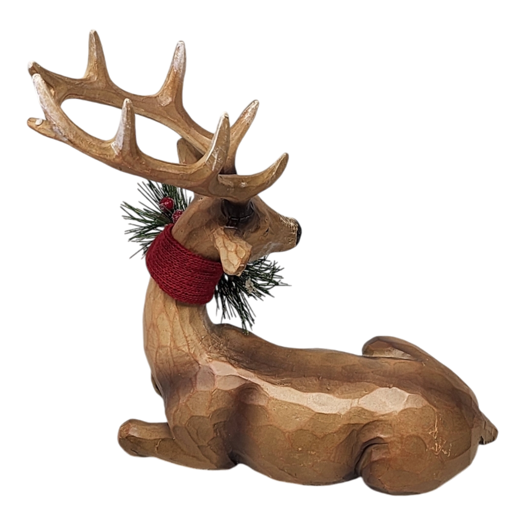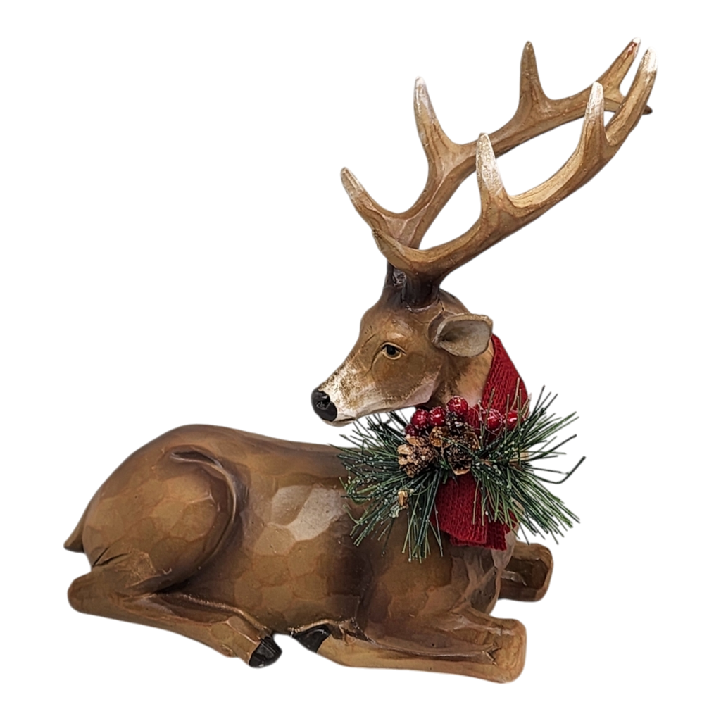 Infuse your holiday décor with the enchanting charm of our Resin Laying Reindeer Figurine. Comfortably resting at approximately 9 inches tall and 9 inches wide, this delightful piece showcases exquisite craftsmanship in rich, warm tones. Adorned with a festive wreath featuring sprigs of pine and cheerful berries, this figure brings a cozy, rustic feel to any space, making it an ideal accent for your Christmas collection.
