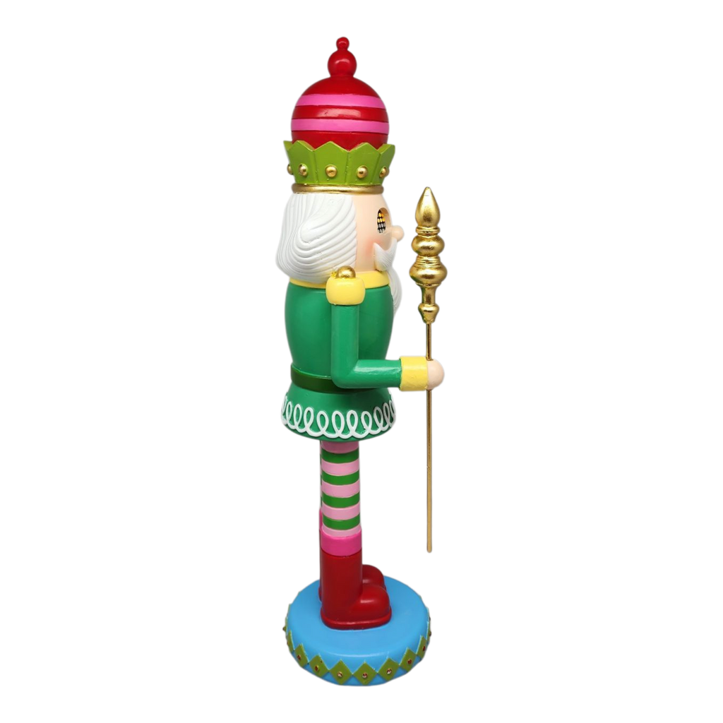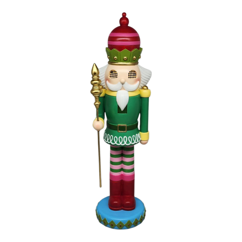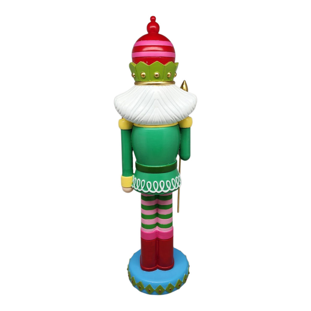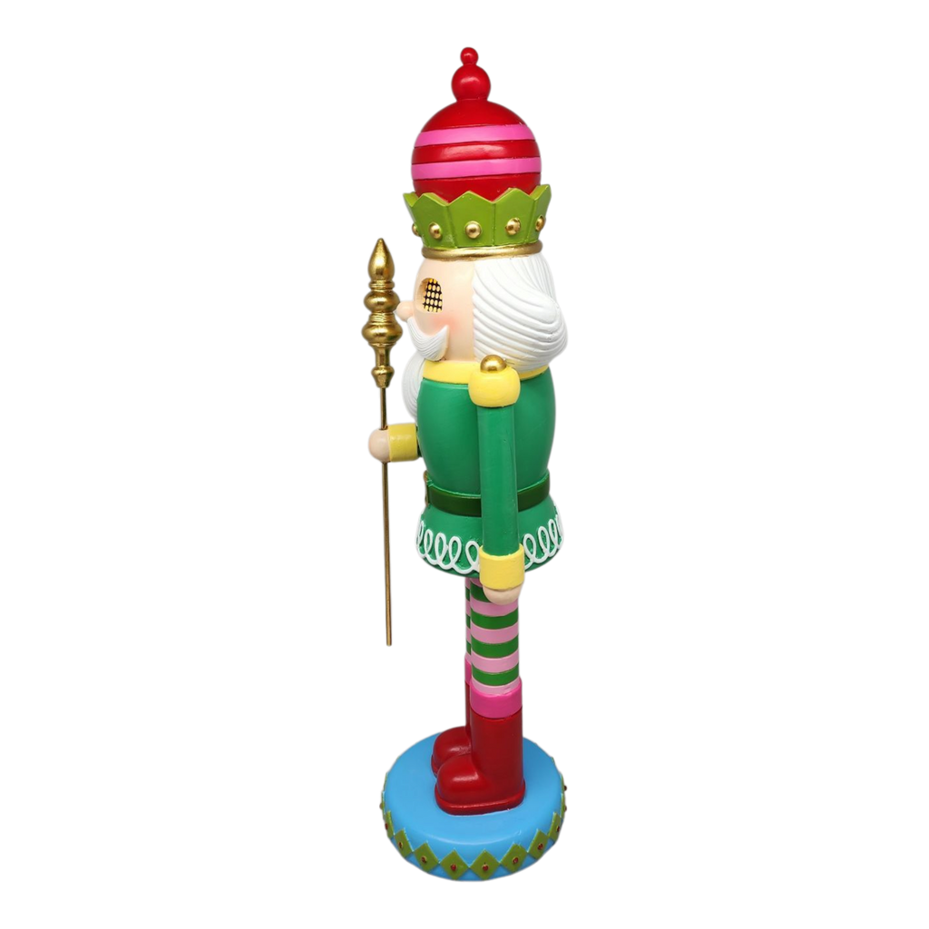 Welcome the holiday season with the delightful Enchanting Nutcracker with Moving Eyes! Standing at an impressive 19 inches tall, this vibrant and whimsical nutcracker is sure to capture the attention and hearts of all who see it. Dressed in a colorful outfit featuring rich greens, reds, and playful stripes, this charming piece embodies the festive spirit of Christmas.