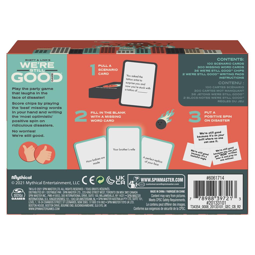 - PERFECT FOR PARTIES & GROUPS: We`re Still Good is easy enough for anyone at the game night. Pull a scenario card, fill in the blank with a missing word card, then put a positive spin on a disaster.