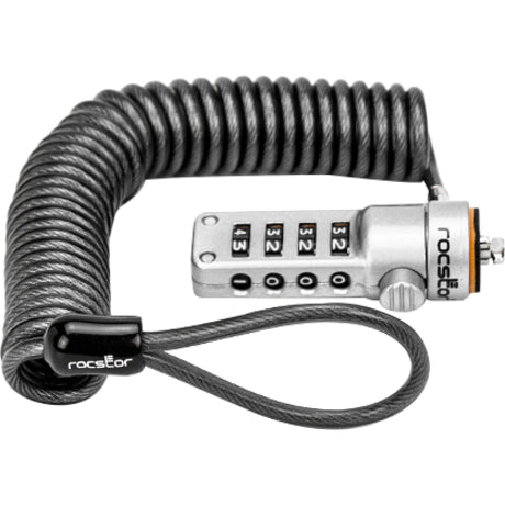 Rocstor Rocbolt Portable Security Cable With Combination Lock and Self-Coiling Steel Cable - Resettable - 4-digit - Galvanized Steel, Zinc Alloy - 6 ft - For Notebook, Docking Station, Desktop Computer, Monitor (Compatible to Kensington® K64670AM) PORTABLE LOCK SECURITY CABLE 4 DIGIT LOCK