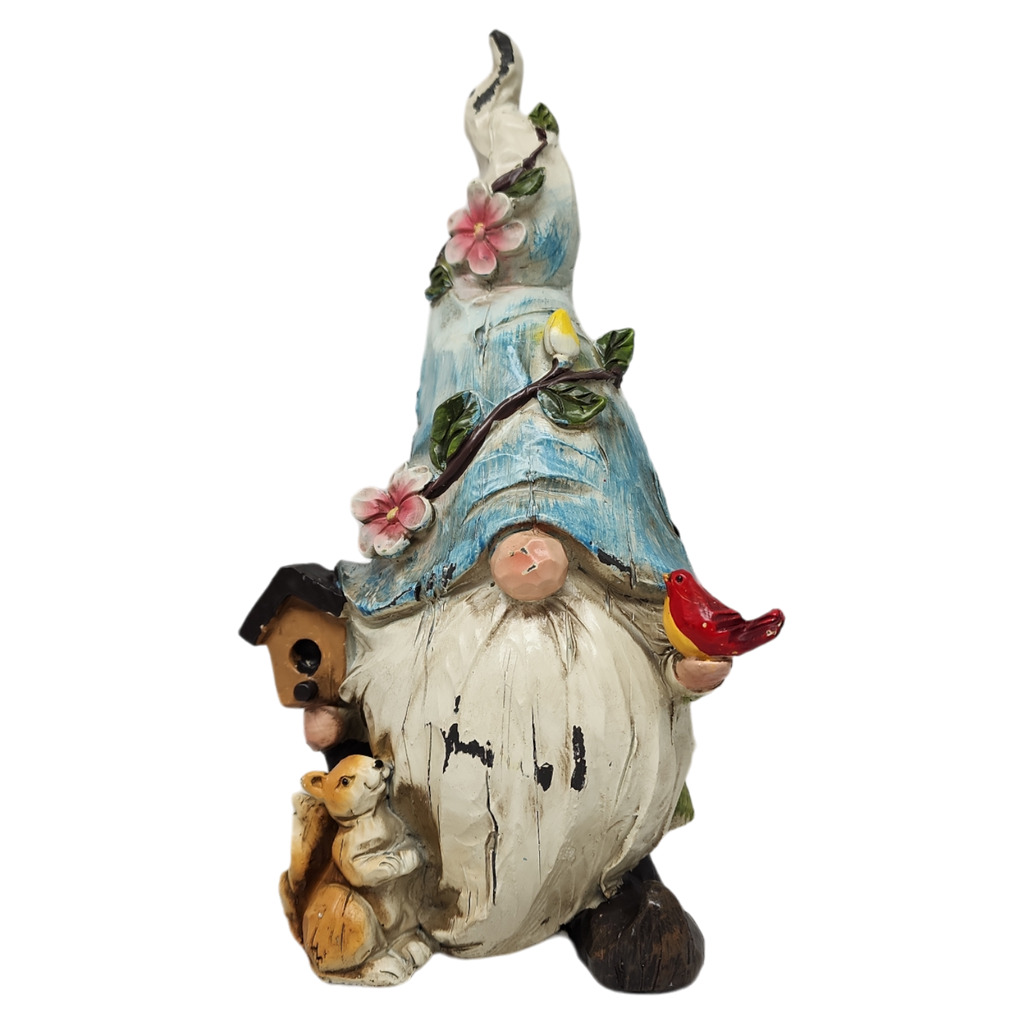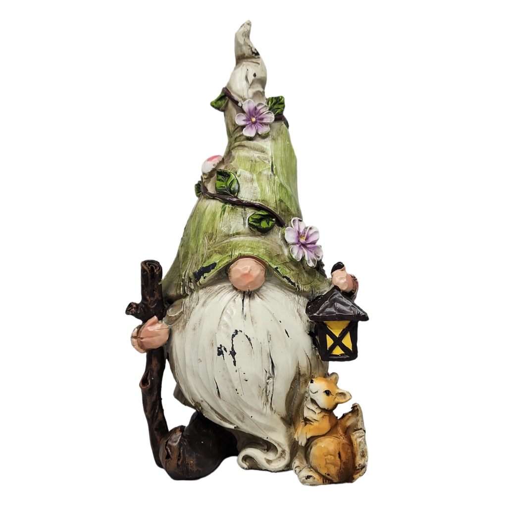 Add that extra touch to your garden, sunroom, or greenhouse with one of these adorable Rustic Garden gnomes. Each gnome has a floral accented gnome hat, and has a woodland animal friend to help in the garden.