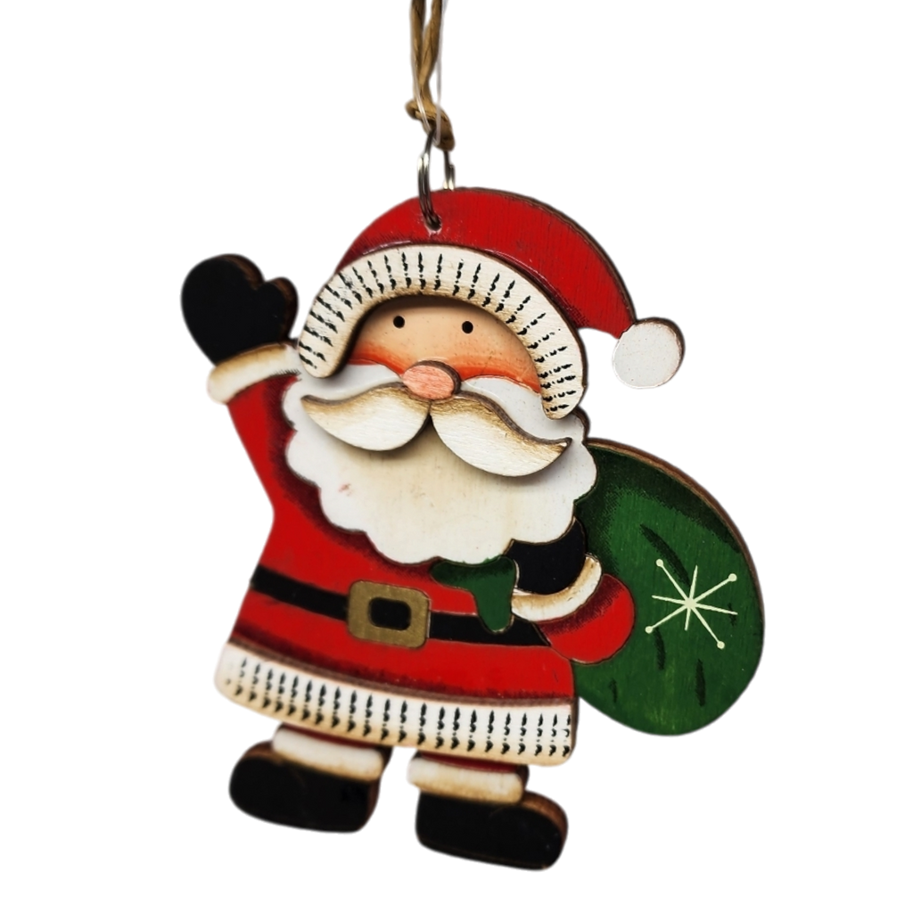 Bring the jolly spirit of Christmas to your home with this festive wooden Santa Claus ornament, standing just under 5 inches tall. This cheerful St. Nick is dressed in his classic red suit, complete with a cozy fur-trimmed hat and a black belt. With a joyful wave and a bag of presents slung over his shoulder, Santa is ready to spread holiday cheer.