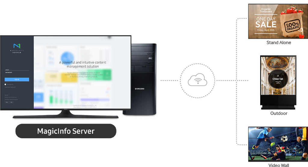 MagicInfo Server is a network-based management solution designed to enable easy and efficient control of content and devices. Create and publish content using a mobile device, such as a smartphone or tablet, as well as a computer. Easily control connected devices. - Easy and fast content creation/publishing and schedule management, anywhere, at any time - Implementation of playlists using a variety of media, such as scripts, messages, video, Flash, and images - Batch management of connected devices without limitation in the number of devices - Backup player, DataLink, statistics, and many other extra features MagicInfo 4.0, the latest updated version of 3.1, features enhanced visual effects and functionality, as well as improved usability with new functions. Use MagicInfo Server now.