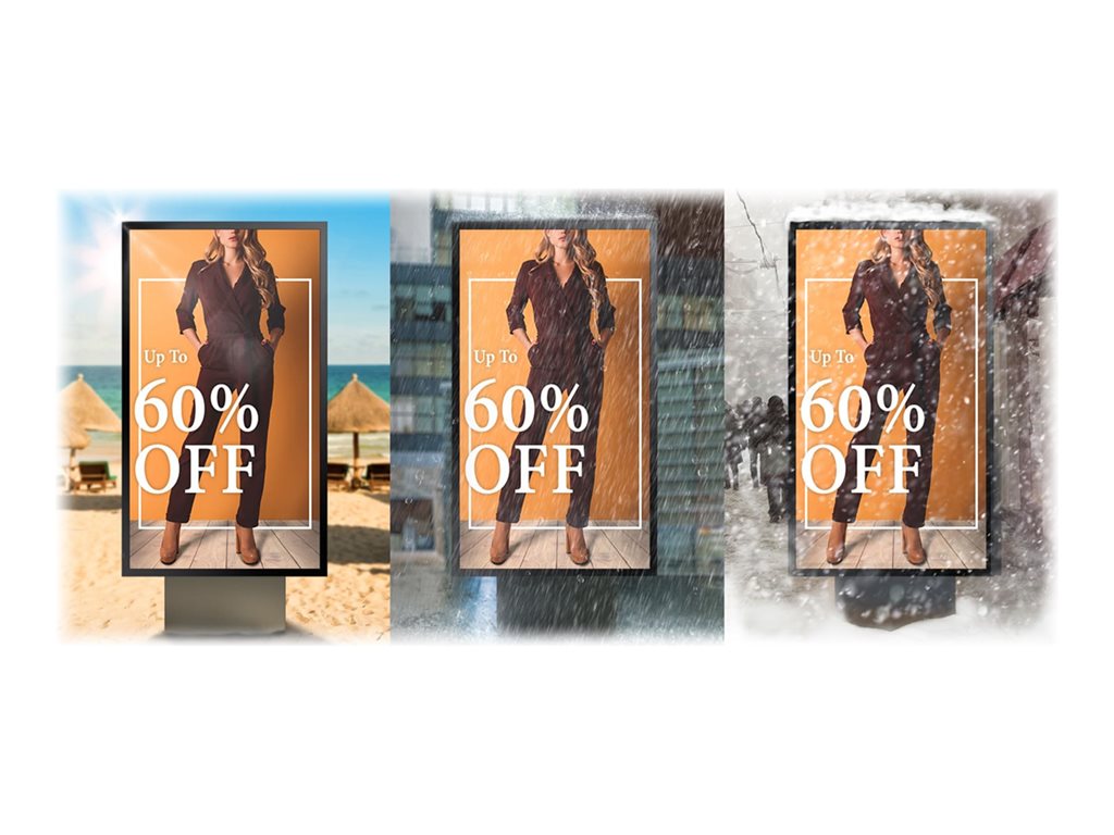 Powerful performance with slim design and outstanding visibility. Standout from the crowd 24/7, come rain or shine with a fully weatherproof high bright all-in-one outdoor signage solution. Designed with exceptional brightness and robust, slim design, OHA-S outdoor displays will capture your customer's attention, even under strong and direct sunlight. A slim, all-in-one composition enables easy installation, while long-term performance is ensured through IP56 protection, anti-reflection technology, vandalism defense and an efficient cooling system. Plus, an integrated power box condenses operational components and supports an ultra-slim frame.