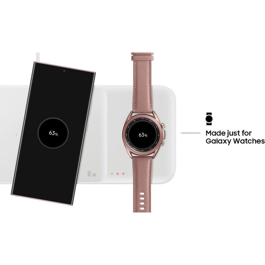 With the dedicated spot for Galaxy watches, you can keep your timepiece powered up to get you through your day. An interior magnet on the right side of the charger guides your watch into place to charge. And on the left you can charge your phone, Galaxy Buds series and more.