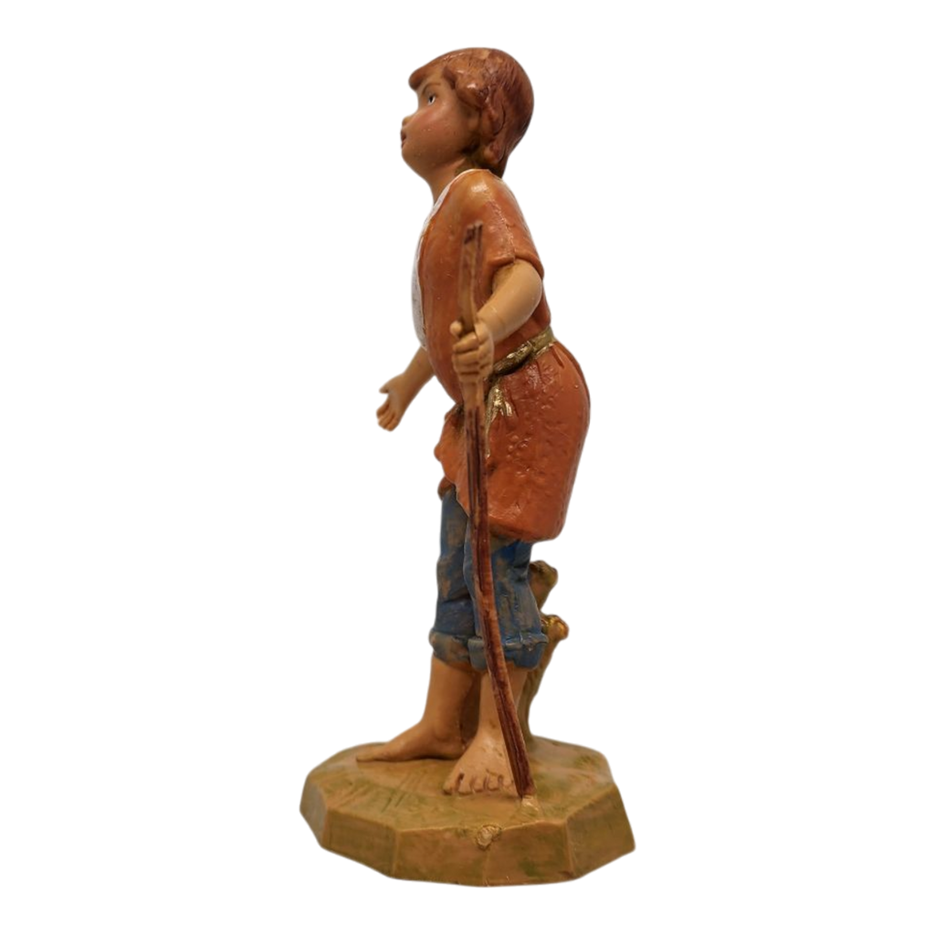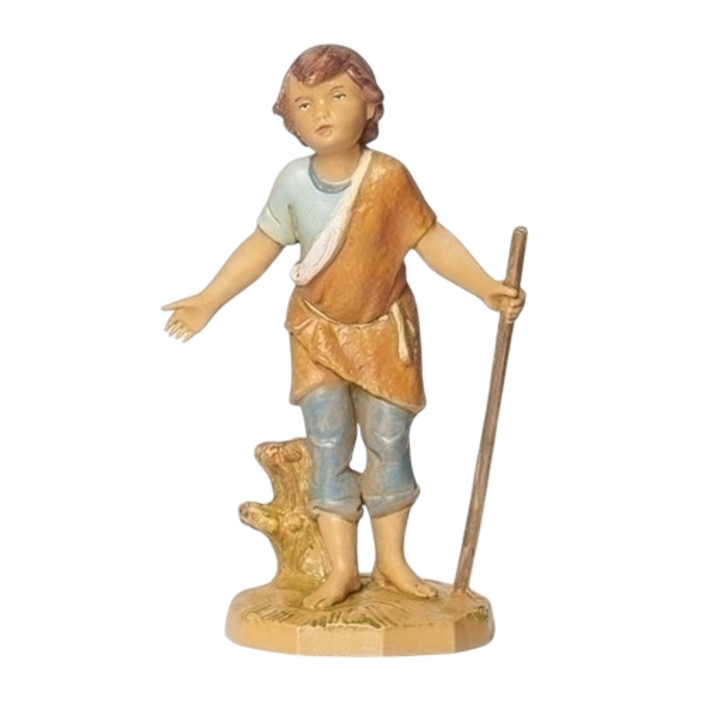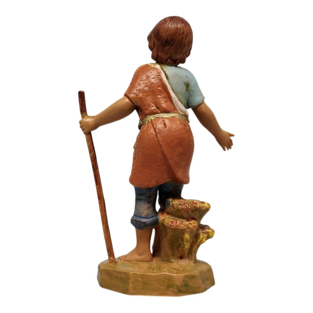 The Fontanini Nativity figure of Savio the Boy Shepherd is a beautifully crafted piece that stands at a charming 5-inch scale, making it a perfect addition to any holiday display. Made in Italy, this figurine showcases the exquisite craftsmanship that Fontanini is renowned for, with intricate details that bring the character to life. Savio is depicted in a relaxed pose, dressed in warm, earthy tones that reflect a pastoral lifestyle. His tunic, adorned with a white sash, and light blue pants rolled just below the knees, evoke a sense of simplicity and connection to nature.