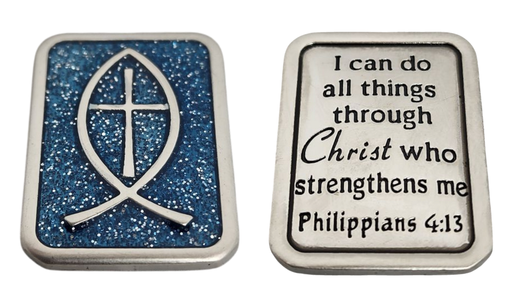 Fish Token: Features an ichthys symbol intertwined with a cross, and the inspiring verse, “I can do all things through Christ who strengthens me.” (Philippians 4:13), highlighting the strength found in faith.