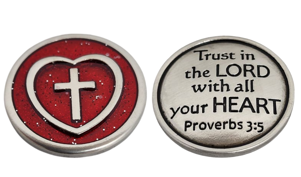 Heart Token: This token illustrates a heart intertwined with a cross, paired with the verse, “Trust in the Lord with all your heart.” (Proverbs 3:5), emphasizing the importance of putting our trust in God’s love.